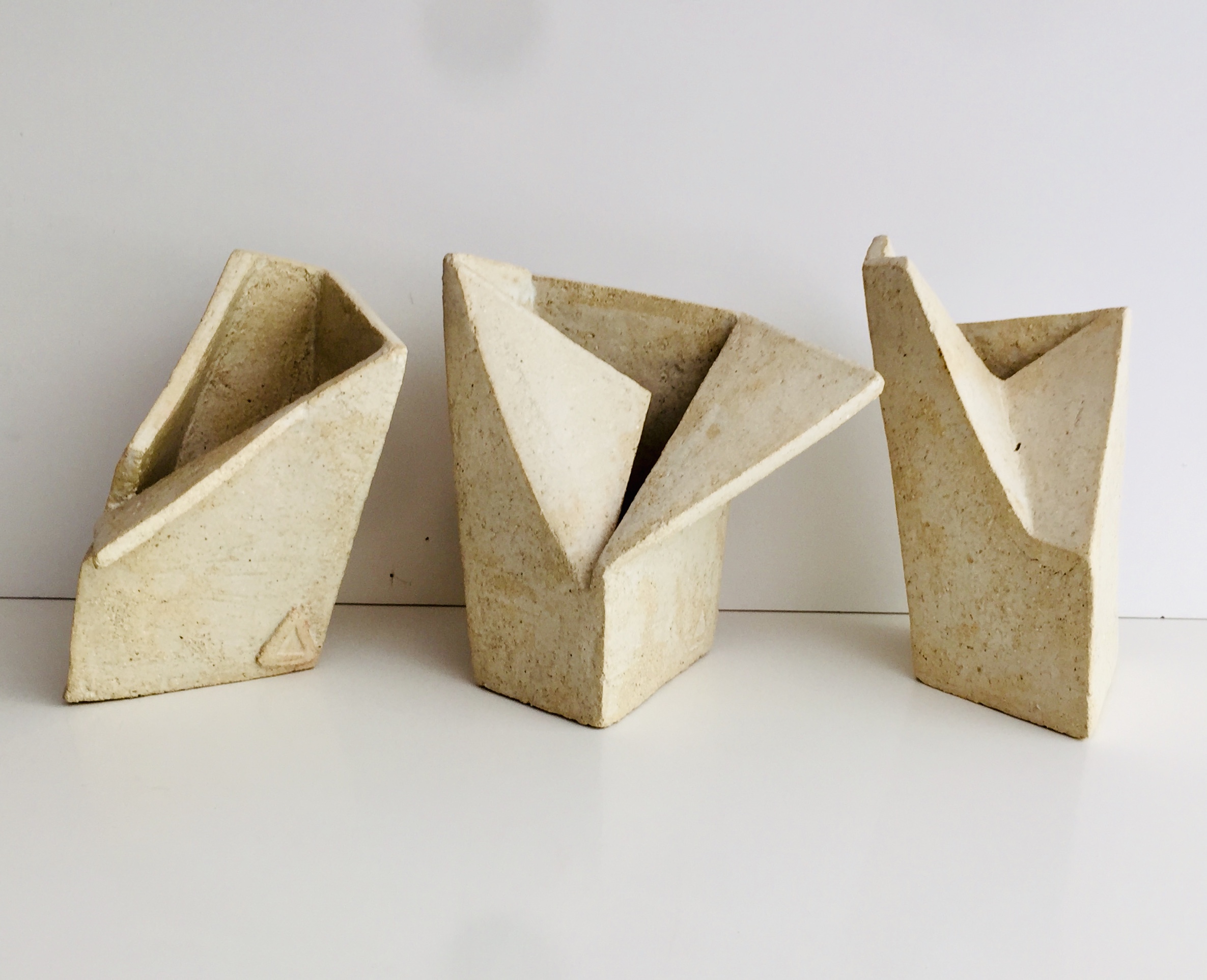 María José Vega, Lic. en Artes Visuales de la Universidad Católica de Chile y Dibujo de figura humana en Barcelona Academy of Arts, presenta “Pliegues”, que problematiza entre la condición efímera o duradera de los materiales y el significado que le otorgamos como sociedad a los mismos. De ahí, el desplazamiento del material utilizado: papel por cerámica, que no solo reemplaza el método de construcción (plegar una hoja), sino que altera la perdurabilidad del mismo. La cerámica permite al objeto persistir y burlar la condición efímera del papel.